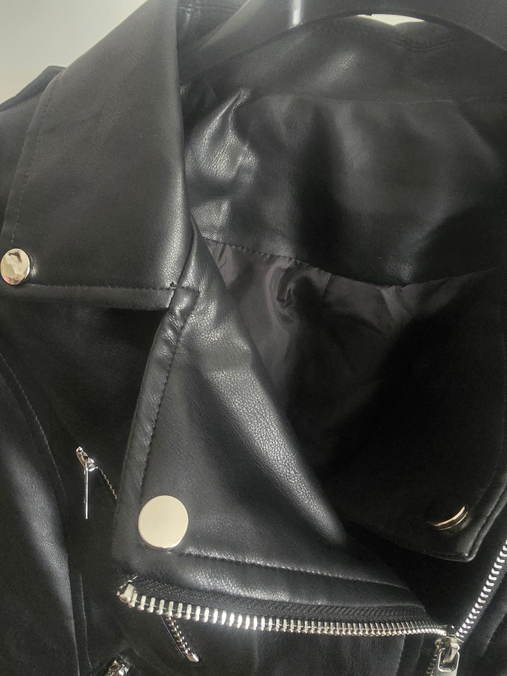 Giacca modello Chiodo, realizzata in pelle ecologica con zip laterale e cintura regolabile in vita. Vestibilità aderente.