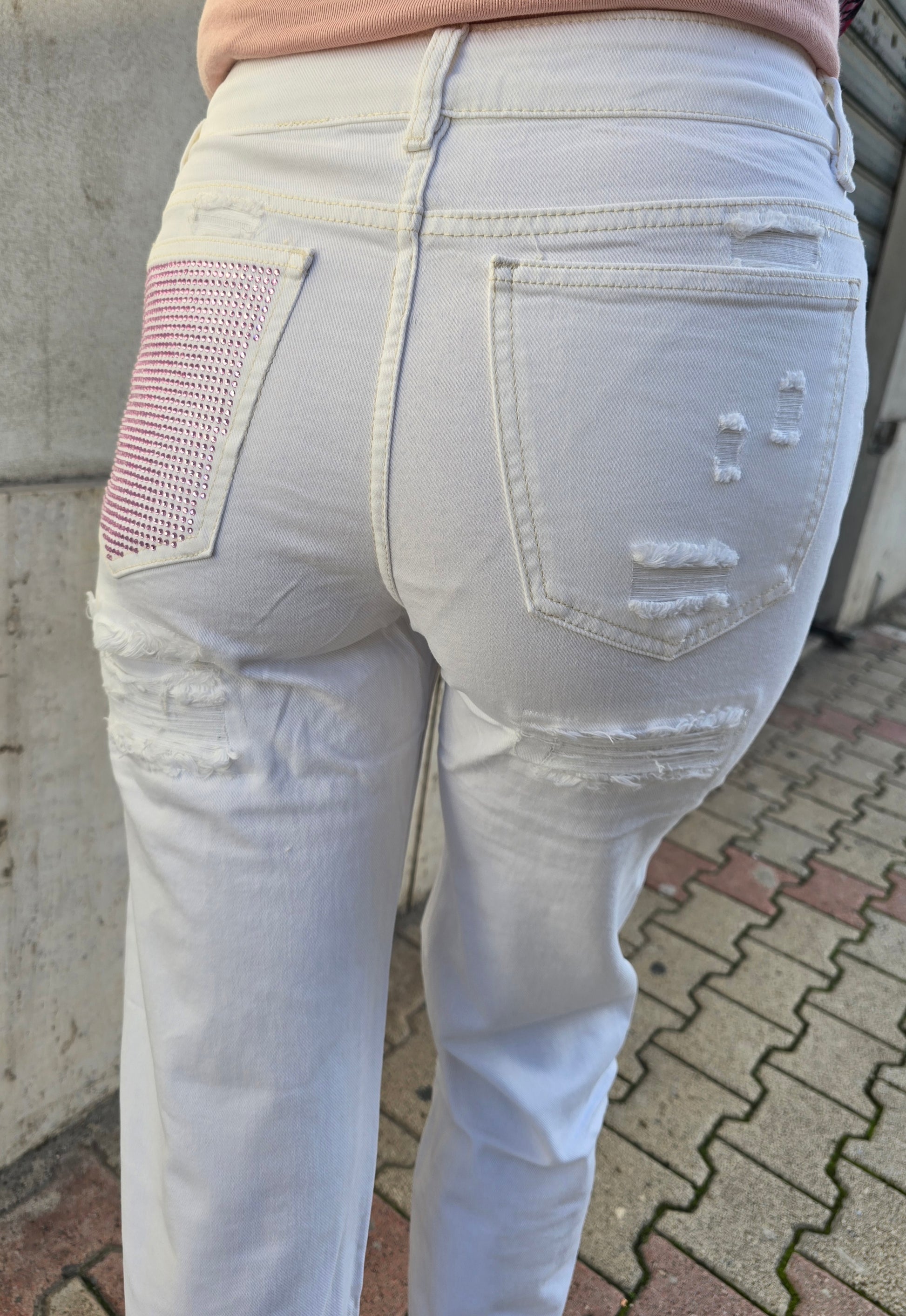Jeans wide leg bianco con tasca rosa glitter