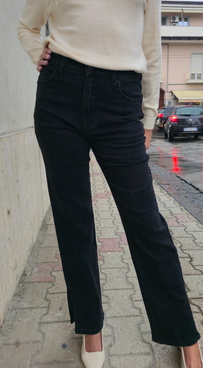 Jeans neri a vita alta con spacco laterale